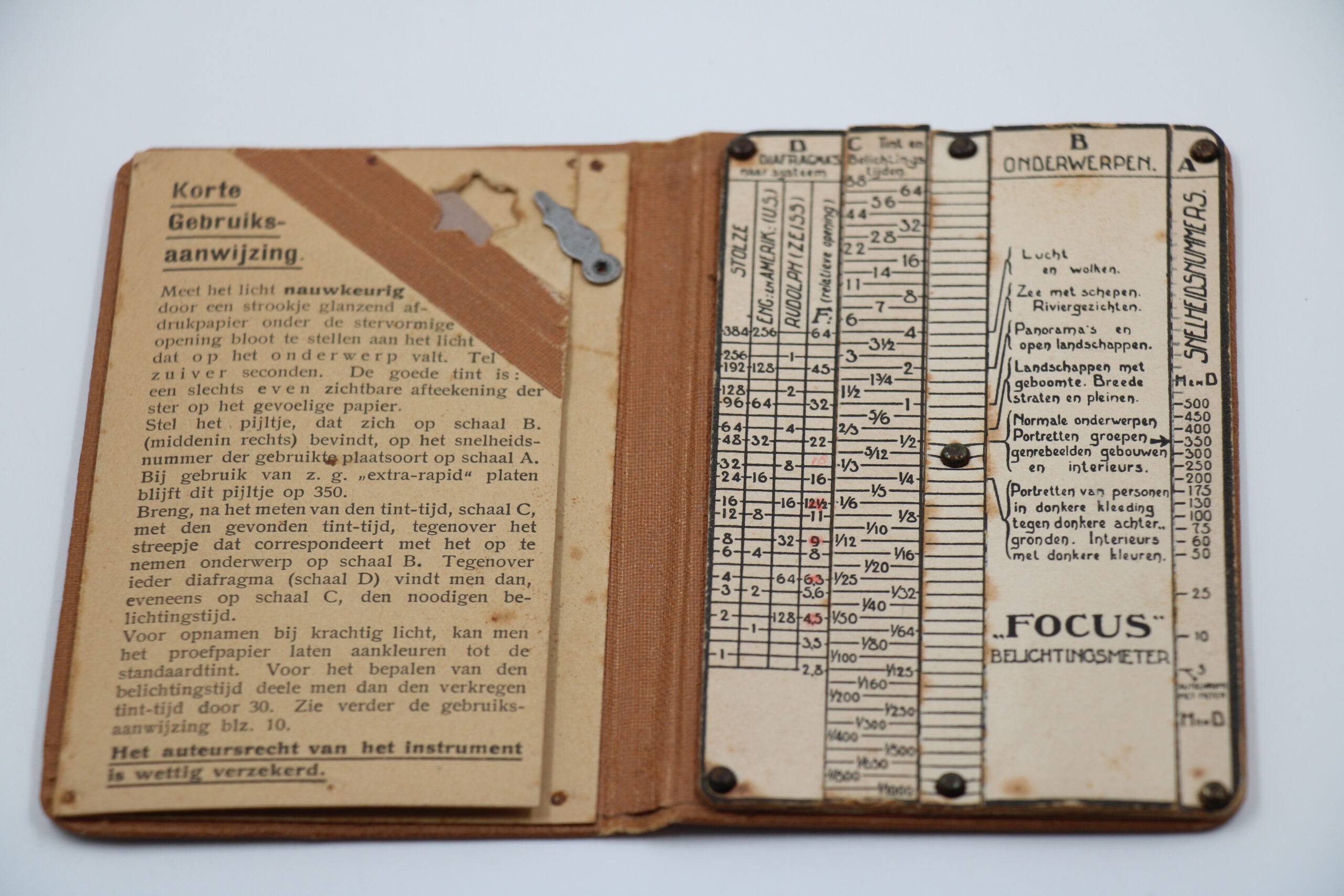 “Het dikke boekje is een actinometer; je kan de linkerkant open klappen door het palletje naar rechts te draaien om daar lichtgevoelig papier in te leggen met de gevoelige kant naar je toe. Je zorgt ervoor dat het “sterretje” dan met nieuw papier te zien is. Om de belichtingstijd te bepalen doe je het (normaal dichte) boekje open en je belicht het sterretje zolang totdat de kleur van het nieuwe papiertje gelijk is aan de kleur van het referentiestukje ernaast. Je kan dan aan de hand van de tabellen de juiste belichtingstijd aflezen. Een heel gedoe! Uitgebracht rond 1917.”