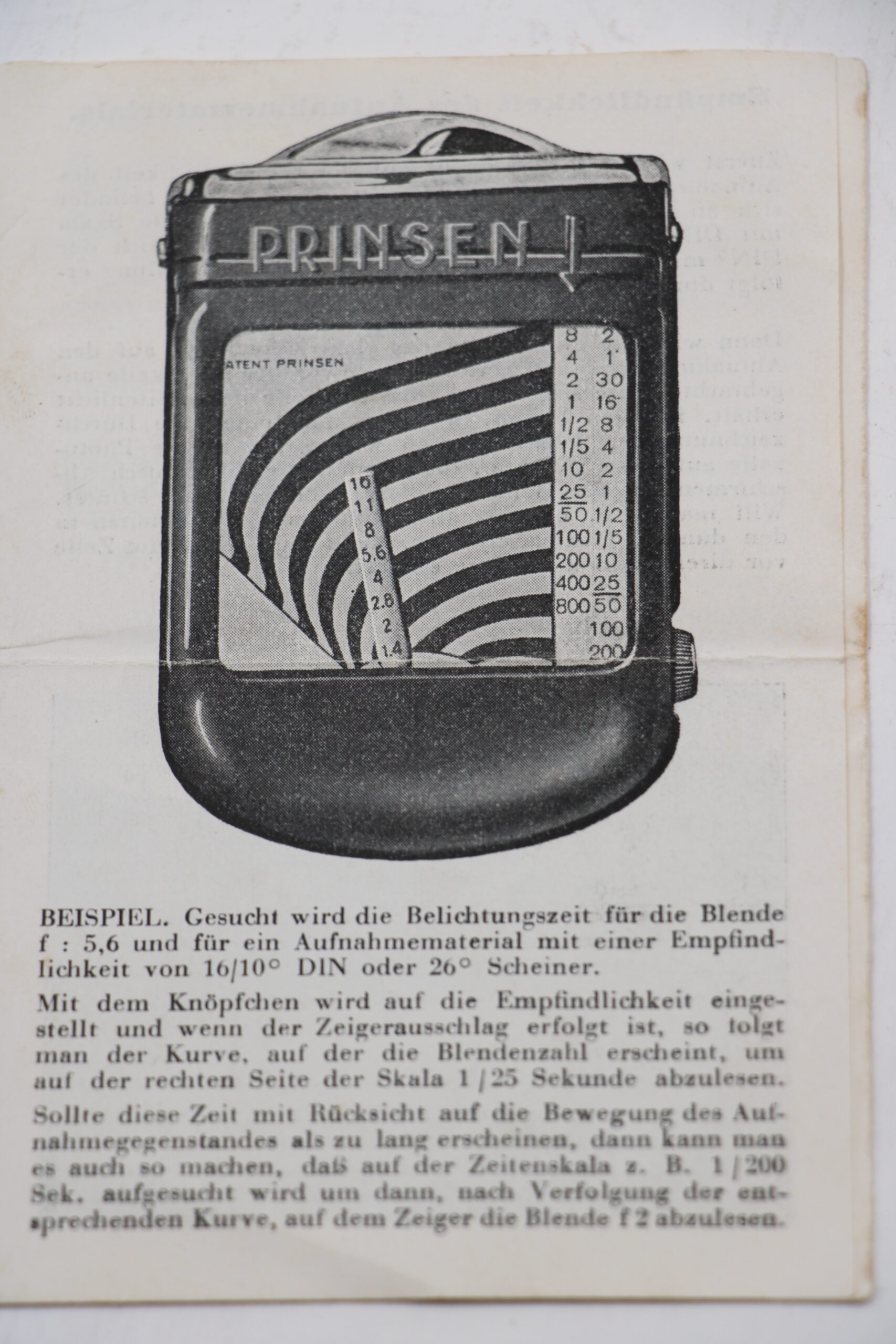 Op deze zwarte bakelieten lichtmeter staat wel de naam Prinsen, maar ontbreekt het wapenschild met kroon. Ik kocht hem in de winkel van Roel Fokken tijdens de Fotografica Markt van 2025. Inmiddels heb ik van Simon Spaans een originele gebruiksaanwijzing voor deze lichtmeter gekregen.